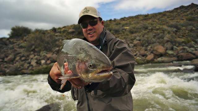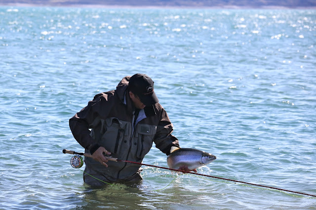 Now there are two primary beats near the lodge on the lake, the "boca" at the confluence of the river and then the "Bay of Pigs".  Each had their own nuances, challenges and opportunities.  Below, my buddy Clark is displaying a quintessential chromer from the Bay of Pigs.  Their color gives them away but you can easily identify a chromer hook-up blind folded: your reel will scream and the fish won't spend much time in the water.